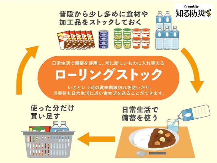 ちなみに、普段から保存の効く食品をストックしつつ、日常的に消費していくことを