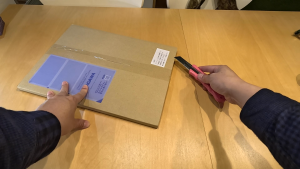 届いた荷物を、オヤジが慎重にカッターで開けています。
