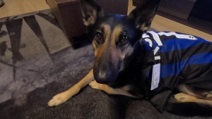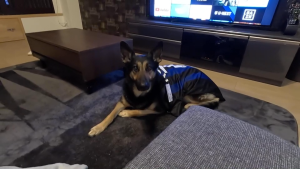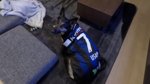 愛犬、耐えろ・・・! 先日オヤジが着ていたガンバ大阪のユニフォームが家に届いた時のお話