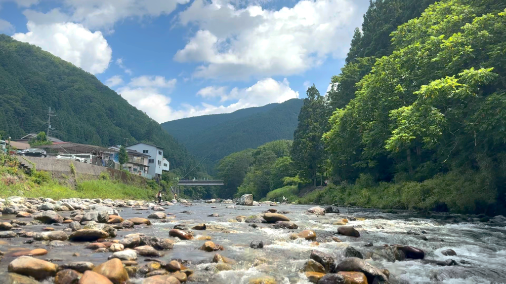 こちらの川、透明度や水温が示すとおり、アユやアマゴがスイスイ泳いでいます。