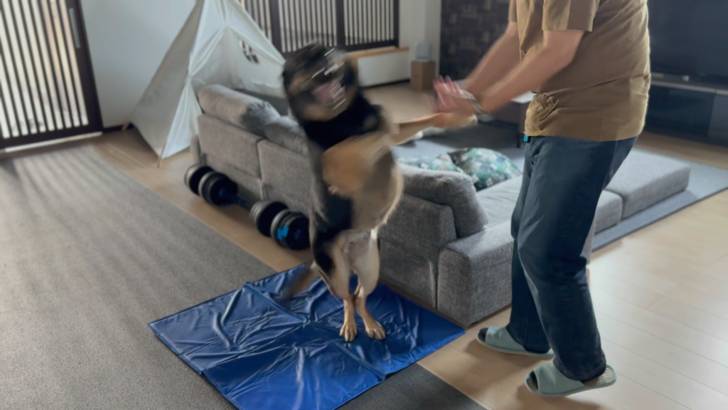 最近、暑くなってからは、夜の散歩の時間になったらいっつもあんな感じです。