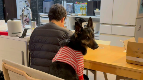 食事中じゃないのに、オヤジにピッタリくっついて座っています。