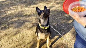 飼い主を手玉に取ってオヤツを食べることに成功した犬のニヤリ顔