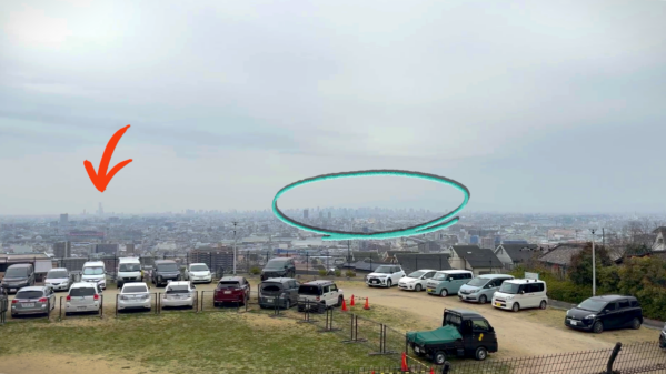 ちなみに、赤い矢印が大阪で一番高い建物・あべのハルカス(高さ300m)!