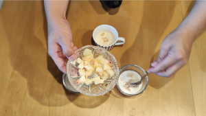 アイスクリーム液が出来たら、切った桃を入れていきましょう。