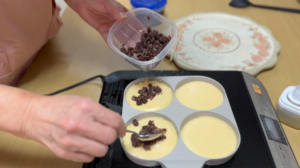 外側がほんのり焼けてきたら、つぶあんを入れちゃいましょー!