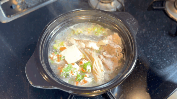 ブロッコリーとニンジン入りの鶏団子、豚肉、鱈、豆腐、エノキ、白菜!