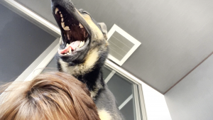 診察台の上でガタブルになった維桜さん、初めて獣医の先生にうなっちゃった末、飼い主♀の指をガブっと噛んじゃいました!
