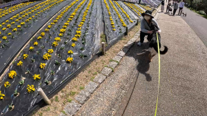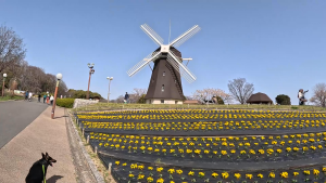 見て見て、風車の足元に黄色と紫のお花が一面に植えられてる〜!
