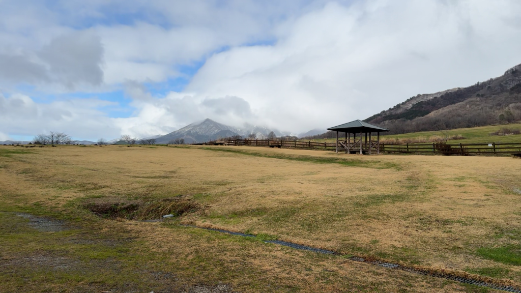 後ろにそびえ立つ雄大な山々、そして、一面に広がるしばh・・・