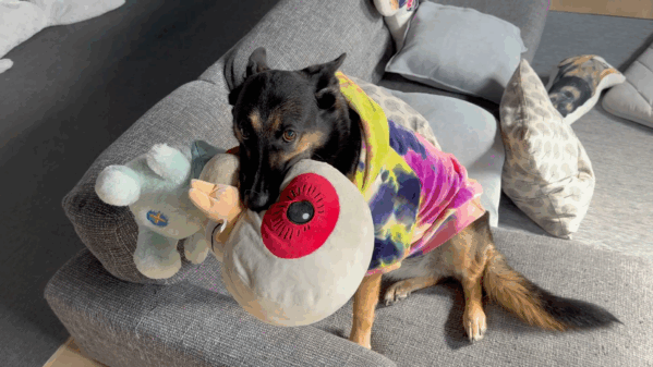 飼い主が帰宅すると、維桜さんはこんなふうにおもちゃをくわえてきて出迎えてくれます。