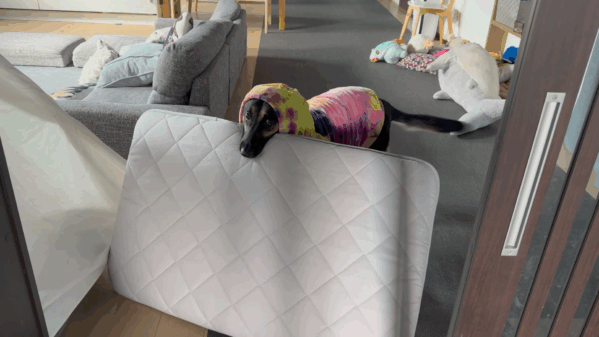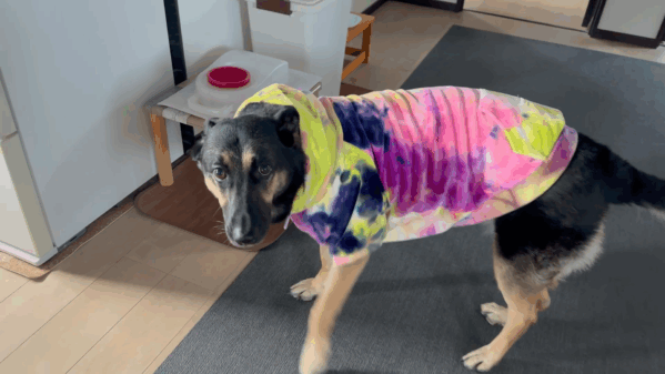 維桜さん、パーカーのフードは被ってるわ、でっかいマットはくわえてくるわ・・・