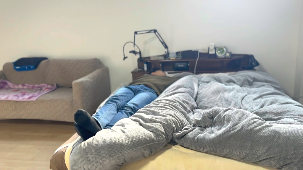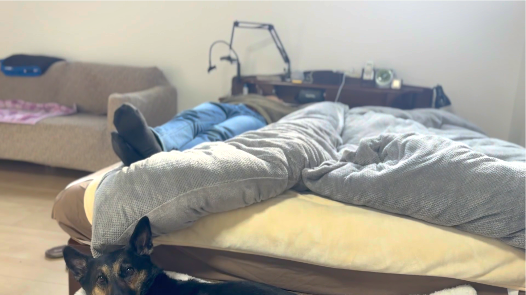 お昼ごはんでお腹いっぱいになったあと、寝室のベッドで寝転がっていました。