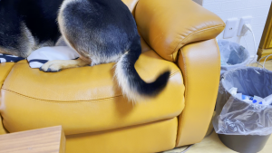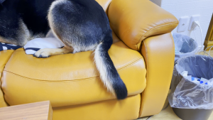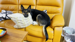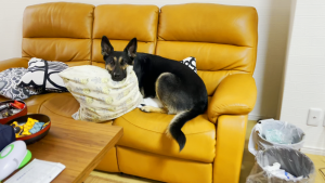 ちなみにアゴを置いているクッションは、家からくわえてきました。