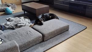 今日も上手にソファーにアゴを置いて寝転んでいます。