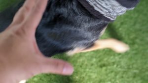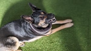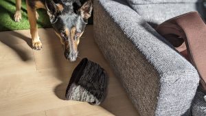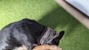 寒がりシェパード、落ちてた(オヤジの)ネックウォーマーで首を温めて返してくれません・・・