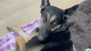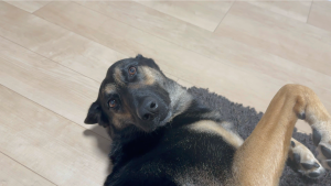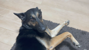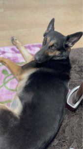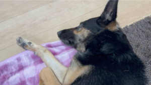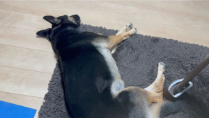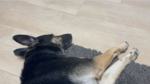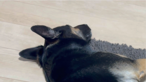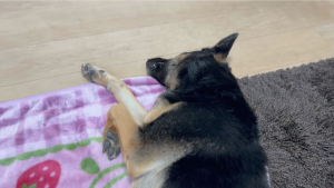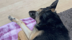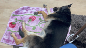 机に向かっていると、足元で維桜さんが熟睡していました。
