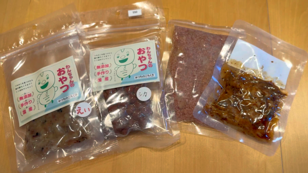 左の2つは、鹿とエイを使ったわんちゃんのおやつ、