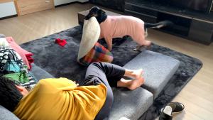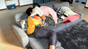 先週末の朝、飼い主♂がソファで腹痛に耐えておりました。