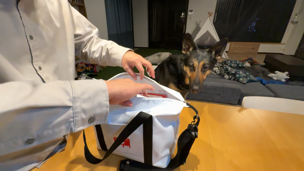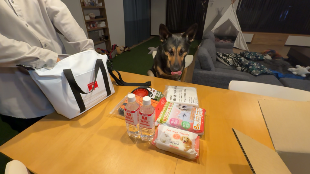 バッグの中に入っていたのは、ウェットティッシュに、ペットシーツ、長期保存水、