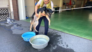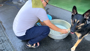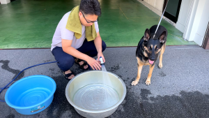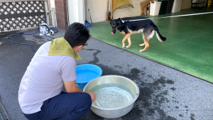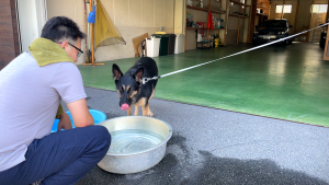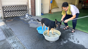 あれだけ川やプールで泳いだり、ずぶ濡れになったりしているのに、どうしてタライだと遊んでくれないのでしょう・・・。