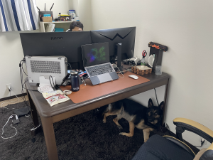 こっちを向いている小さいノートパソコンが私愛用のものです。