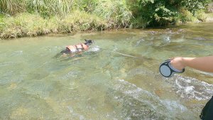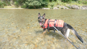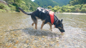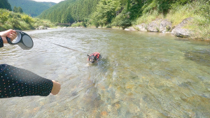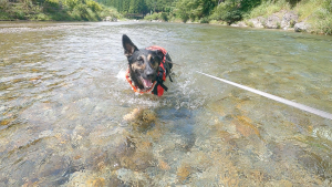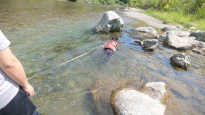 本当はリードを外して、維桜さんに自由に泳いでほしいのですが、川は急に流れが速くなっていたり、万が一、維桜さんが流されてしまった時のことを考えると外せないでいます・・・。