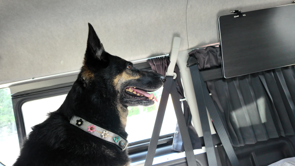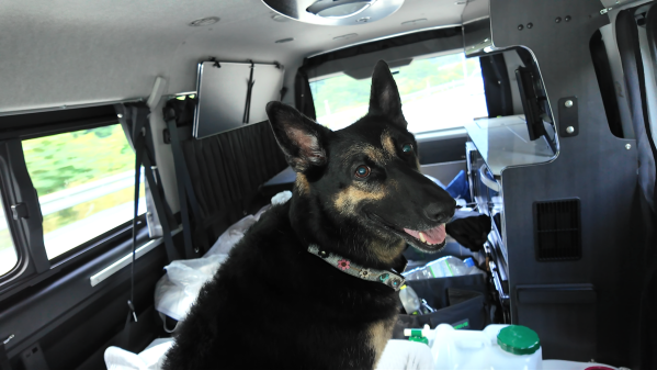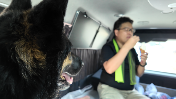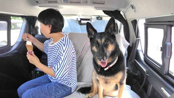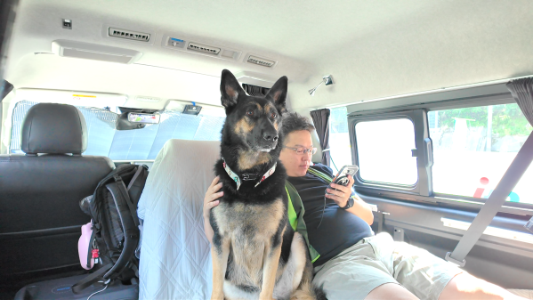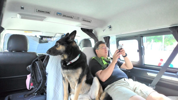 アスファルトが溶け出しそうだったので、オヤジと車内でお留守番です。