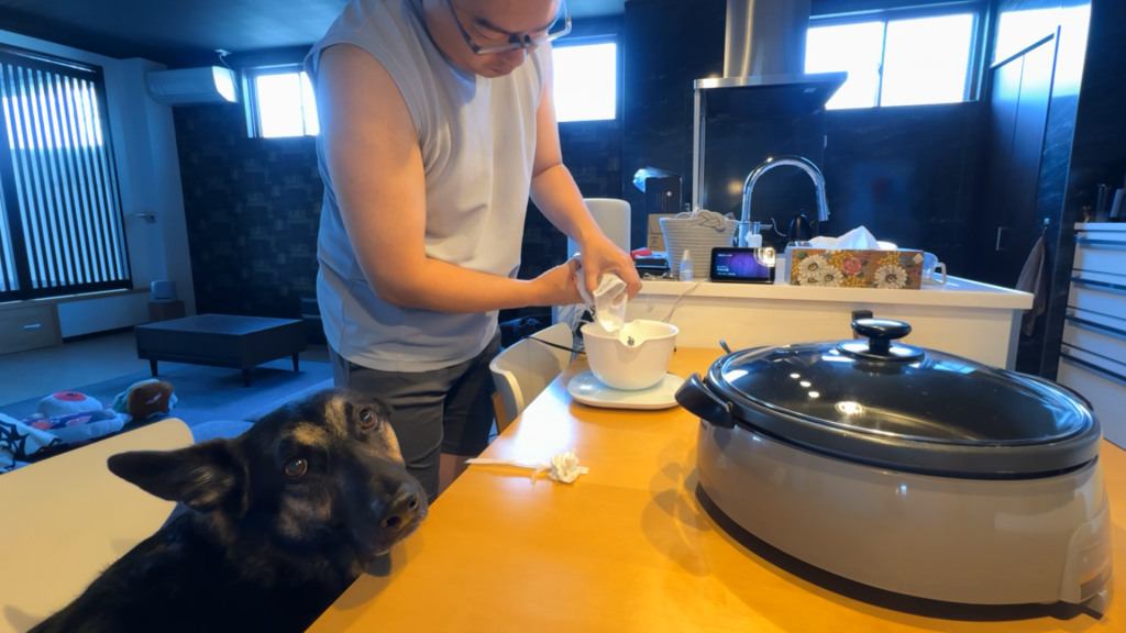 休日の朝食にオヤジがホットケーキ焼いたら、愛犬が食後5分経ってもおかわりのお手してくるw