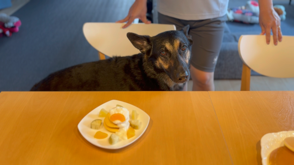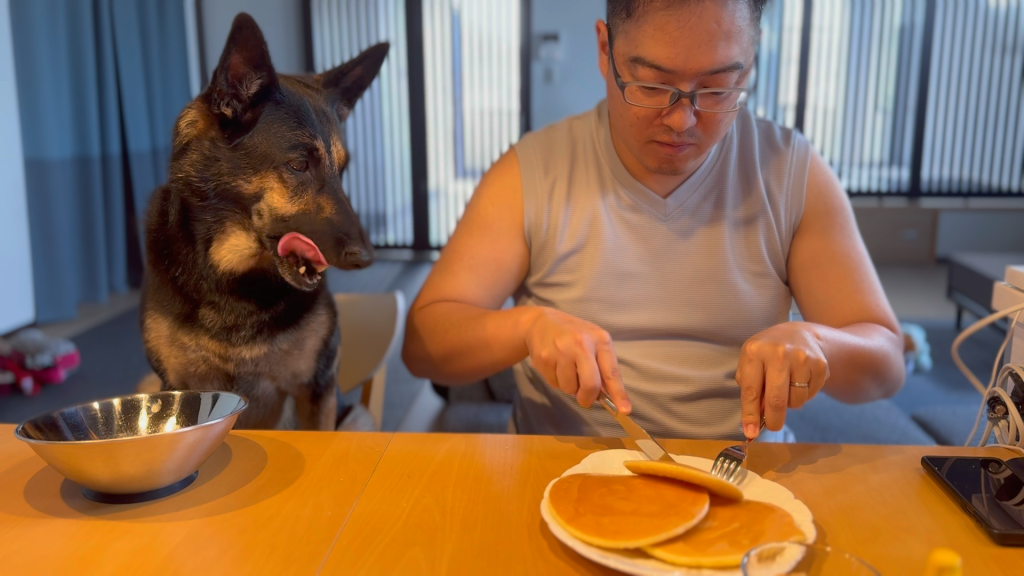 というわけで、皆様、休日の朝食に愛犬と一緒にホットケーキはいかがですか?