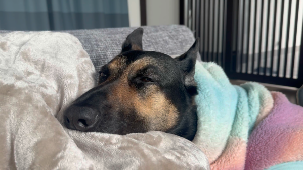 維桜さんが朝日を浴びながら、ソファで寝ていました。