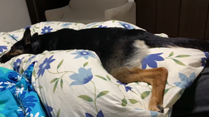 飼い主も夜中に布団を蹴っ飛ばしてることが多いので、今夜もあたくし、体を張って監視中ですの。