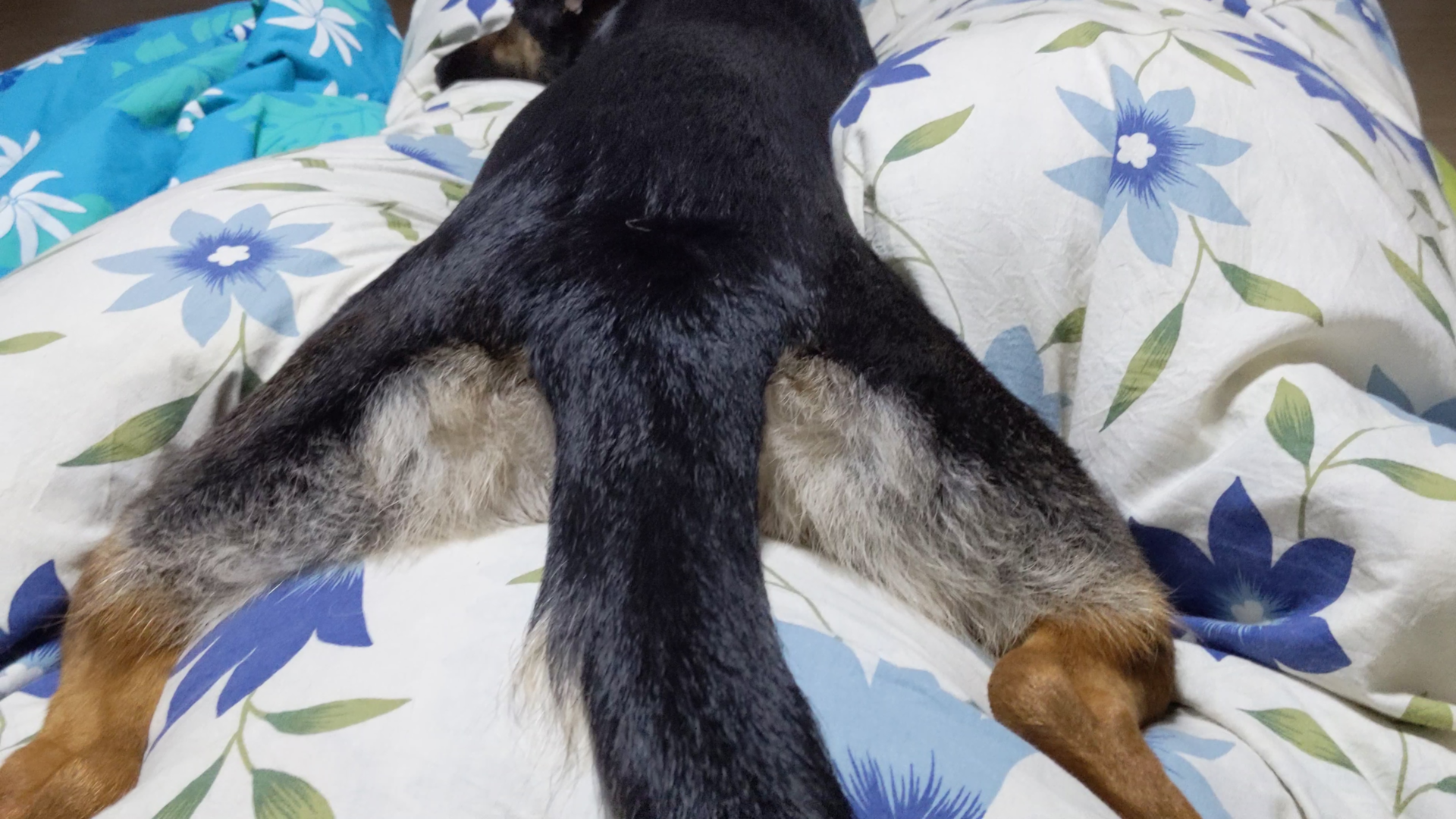 飼い主も夜中に布団を蹴っ飛ばしてることが多いので、今夜もあたくし、体を張って監視中ですの。