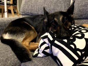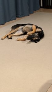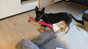 これ、ママ様が超絶ヘタピの裁縫の腕で、何とか補修したのですが、もう噛みまくってボロボロ・・・。