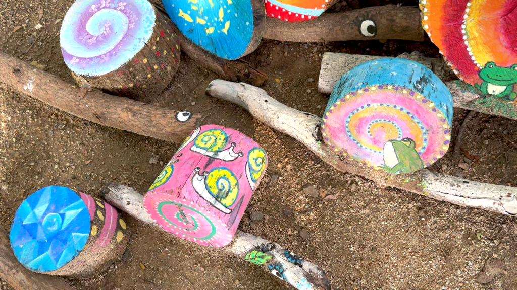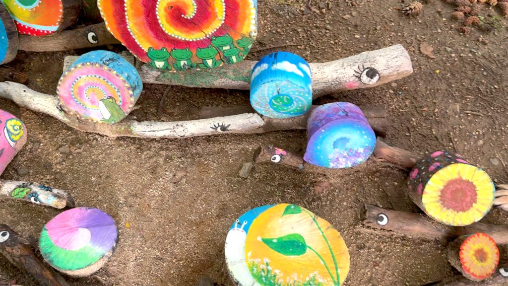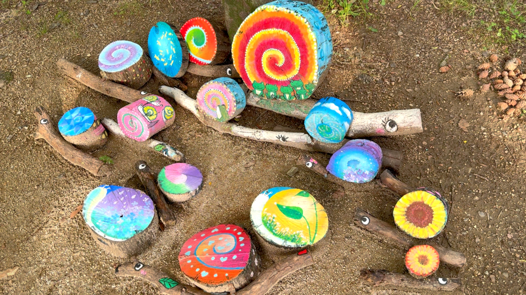 梅雨の時期にピッタリの絵が切り株に描かれています。