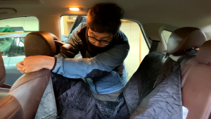 いつものように、助手席から乗って後部座席に入ってもらいましょう。