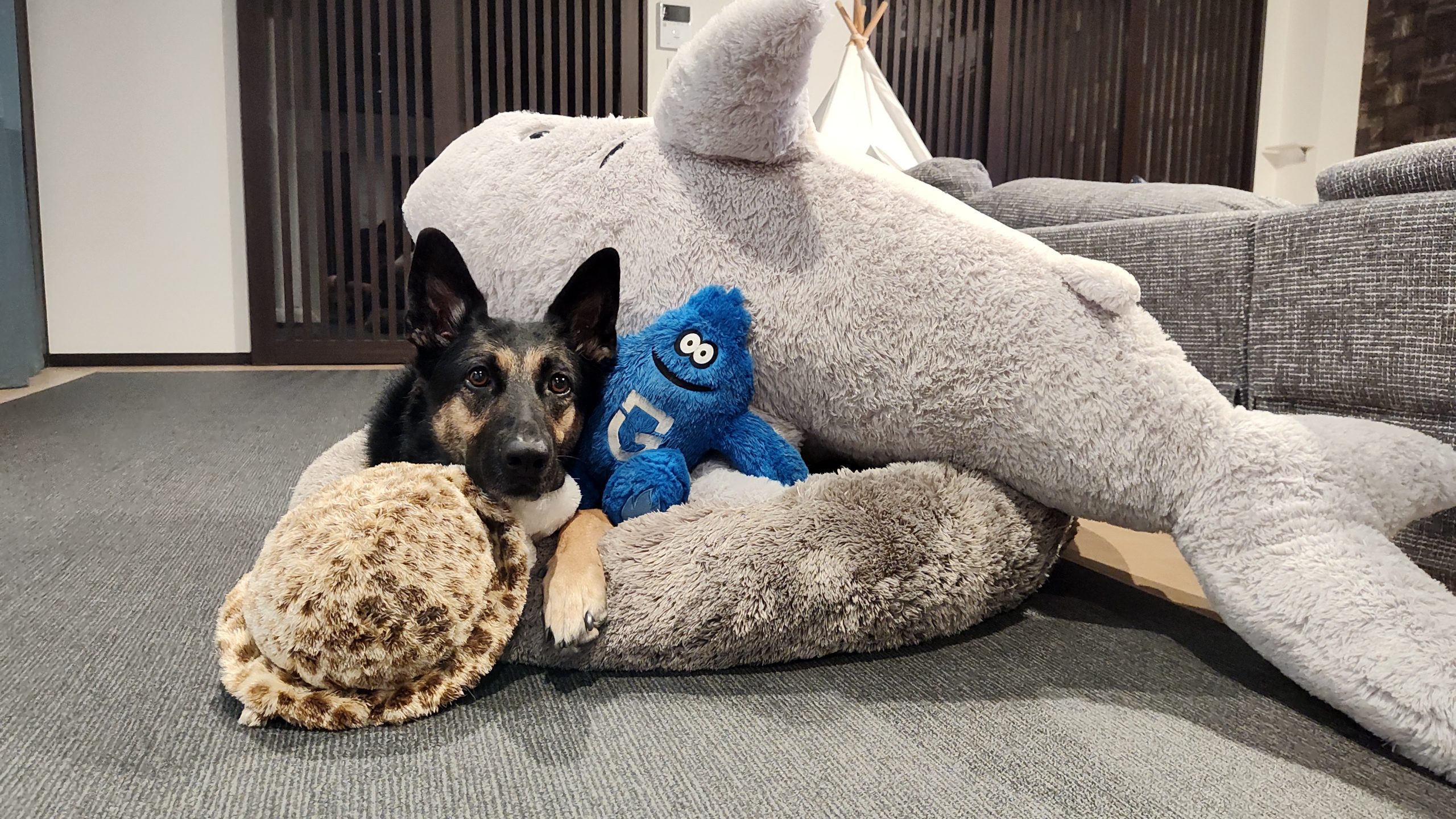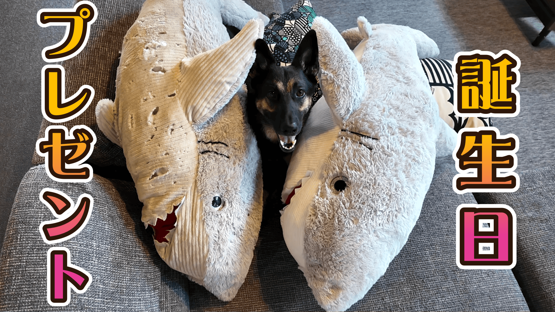 6歳になった愛犬の誕生日プレゼントに新しい巨大サメのぬいぐるみをあげてみた結果w