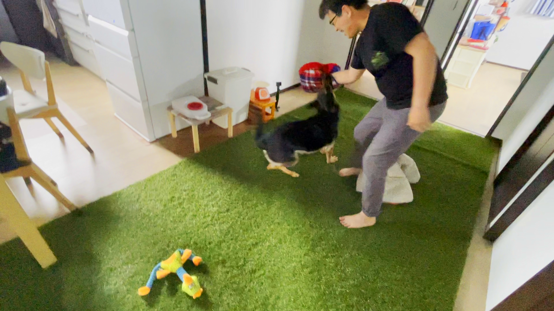 休日の朝は遊びたいモードの犬、ついオヤジを噛む