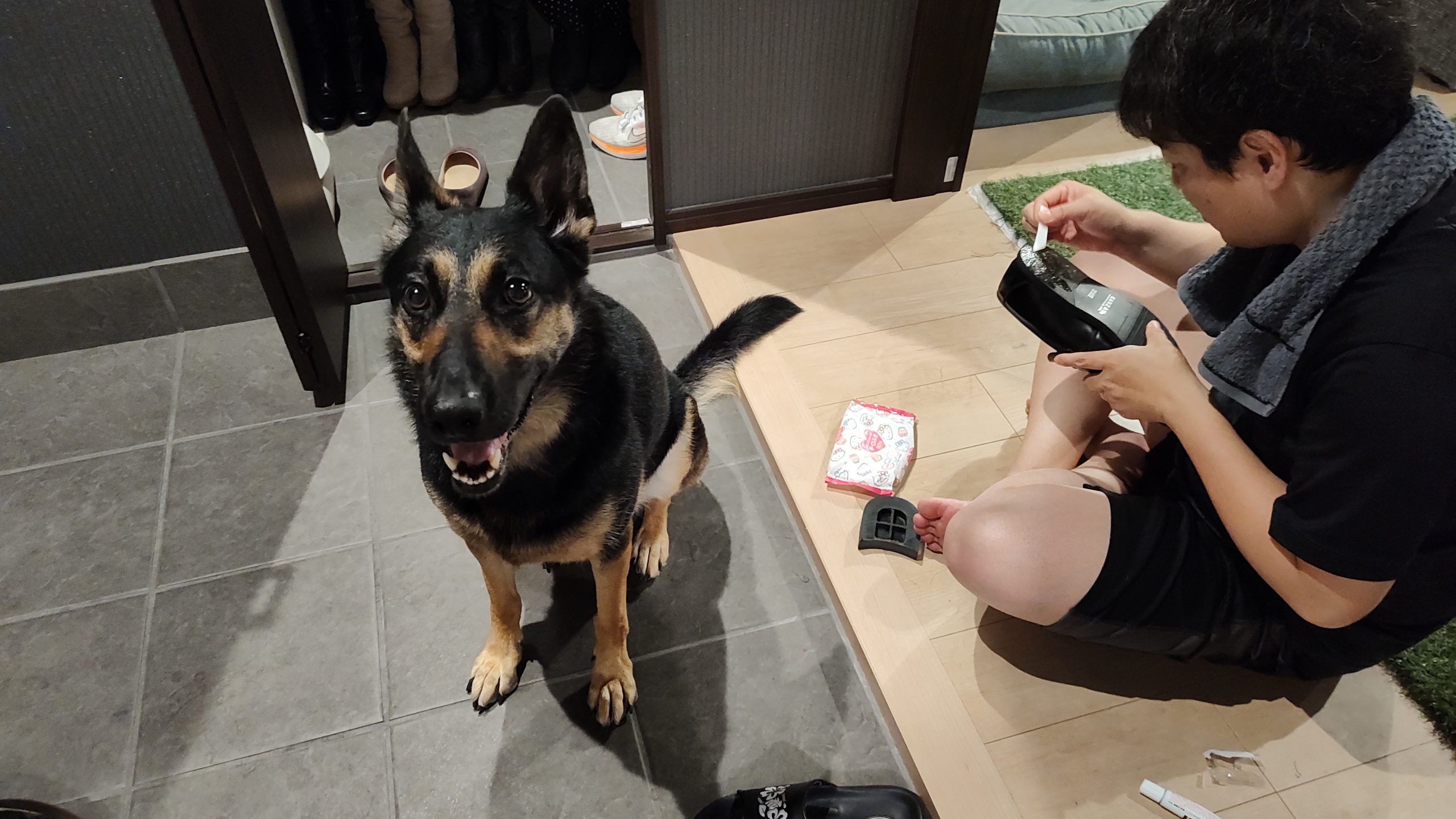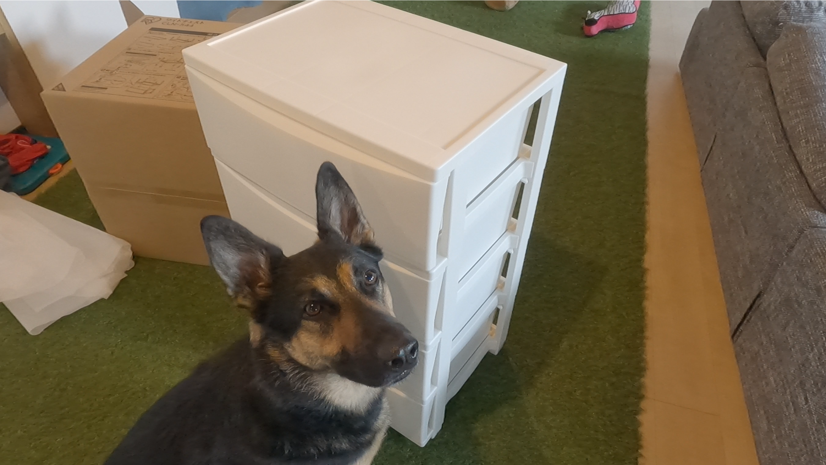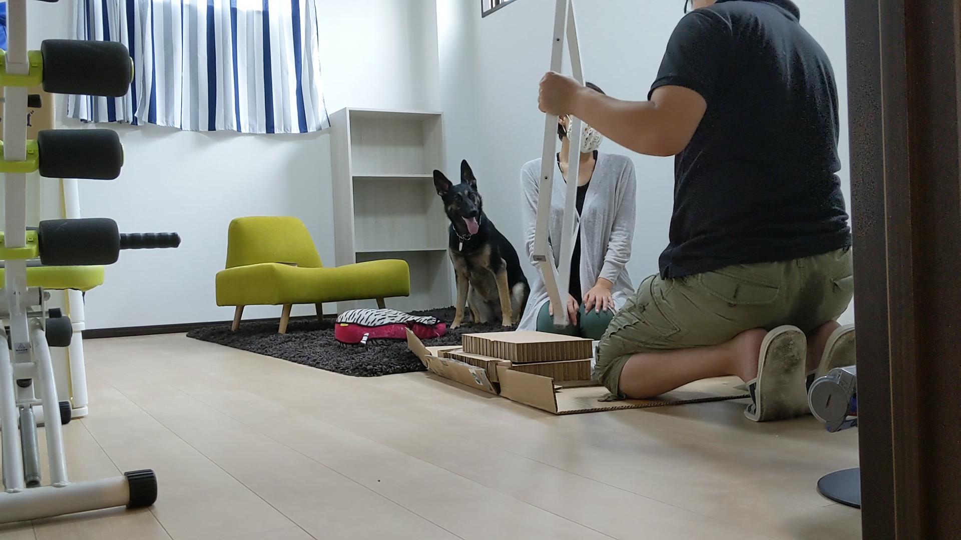 衣装ケースを組み立てるオヤジを見守るシェパード、今日もめっちゃマイペース