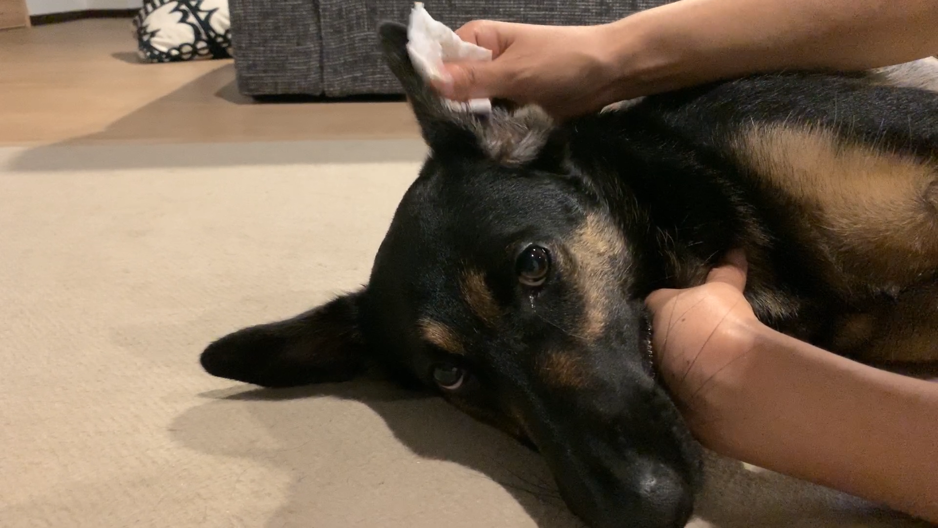 耳掃除を嫌がってハイタッチでごまかそうとする犬