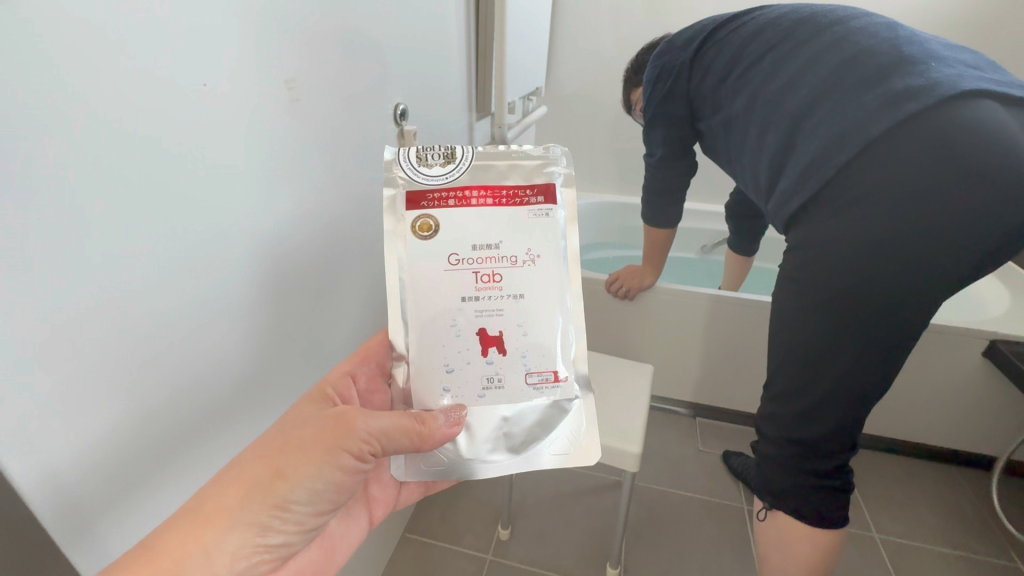 というわけで、「グルーミングタブ」こと、犬用の重炭酸イオンケア入浴剤を持参しました。