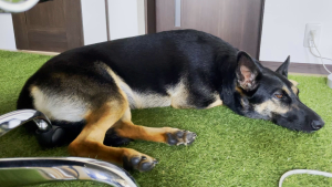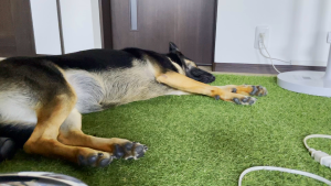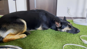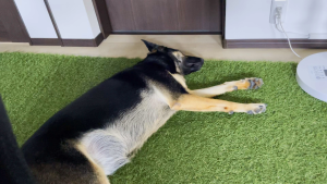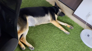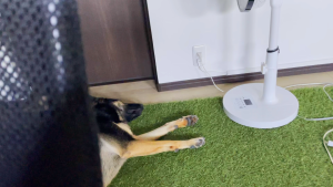 後ろから鳴き声らしき音と、椅子の足を蹴る衝撃に、ふと振り返ると・・・!
