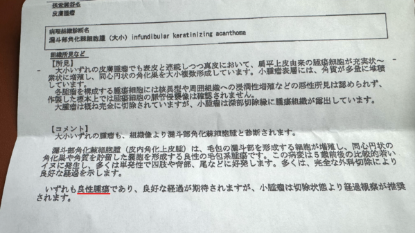 良性のできものでした!