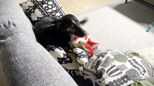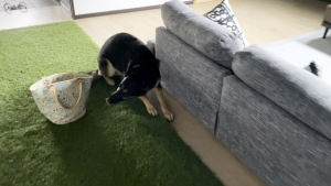 いつものように飼い主♀が買い物から帰ると、維桜さんが大喜びでシマウマのぬいぐるみをくわえながら寝室へダッシュして行きました。