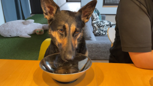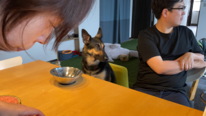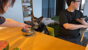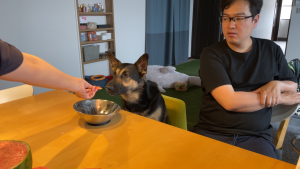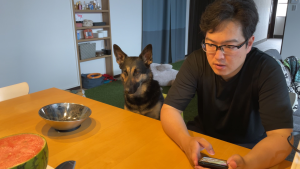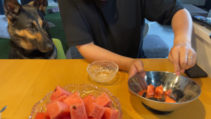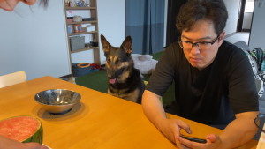 味見でもらったスイカを食べたのがバレた愛犬、口の中にスイカを入れたまま全力否定するw