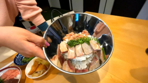 (オヤジのリクエストで、まぐろ、漬けまぐろ、ネギトロのゴールデンウイークスペシャル3色丼です!)