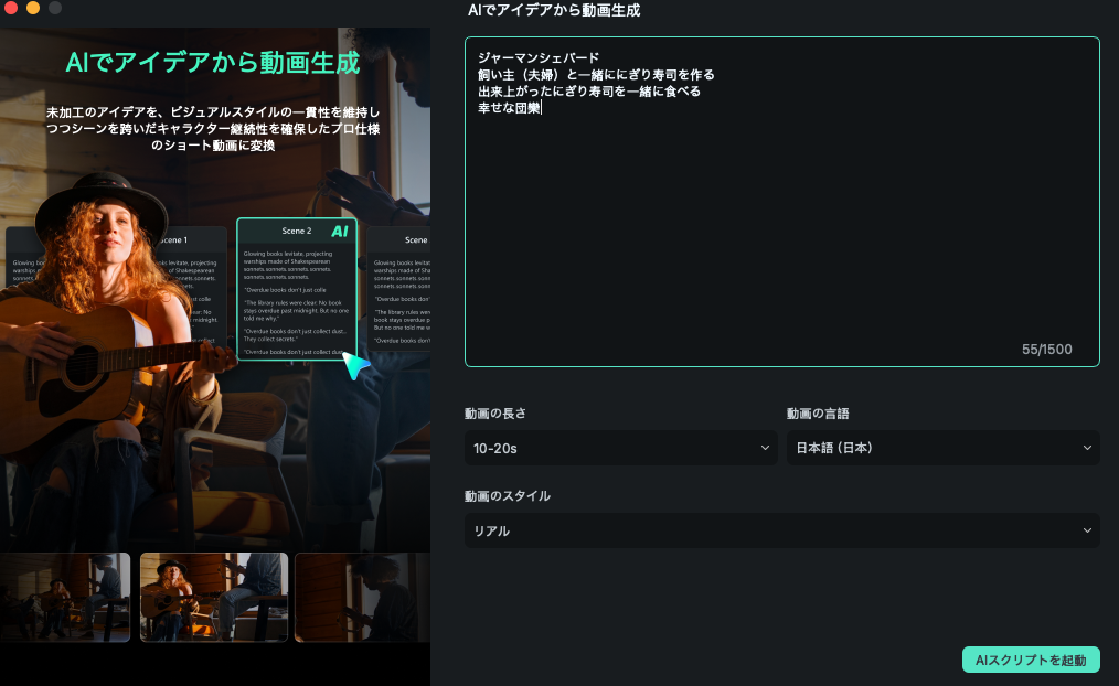 まず、AIに作りたい動画の設定(ストーリー)や登場人物を文字で入力します。