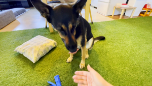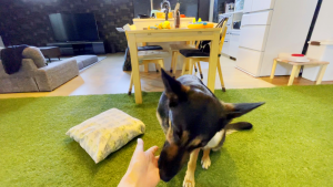 今度はクッションを持ってきてオヤジを誘いますが・・・残念!