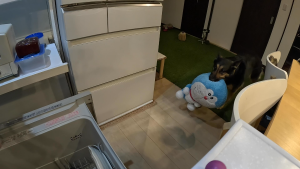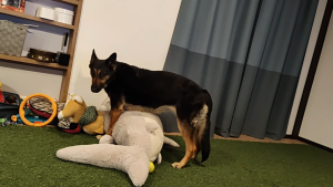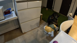 維桜さんが柴犬のぬいぐるみをくわえて、洗い物をしている私(飼い主♀)の元へやってきました。