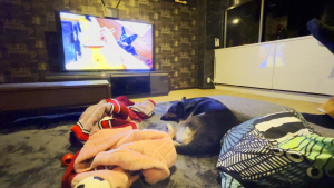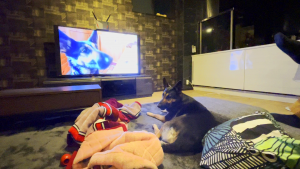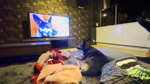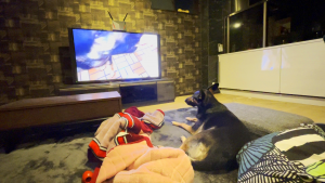 TVに自分の姿が映っていても、大股開きで耳をかきむしっております。